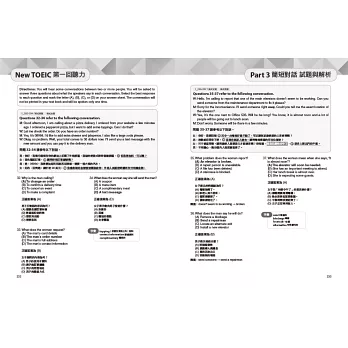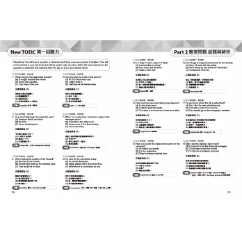 ◆ 2018新制中,Part 2口語問題增加了更多口語素材與簡述。書中題型也反映出這樣的趨勢,像是這題When is a technician coming to replace the damaged parts?其中的「(A) Sometime this afternoon.今天下午。」這個選項,就是很口語的用法。另外如How much did wages increase this year?選項(B) By 10%. 增加了10%。就是新制所謂的「簡述」。