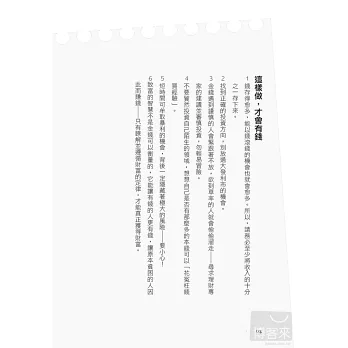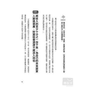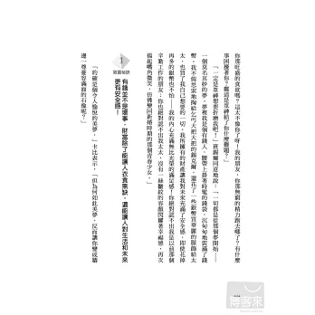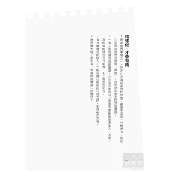 ◎遠離貧窮的7大守則+財富的5大定律+領死薪水也可以還債又賺錢的5大祕訣+65條致富重點提醒,觀念簡單、做起來也很容易:全部的觀念都很容易實踐於生活之中,不必太過忍耐、委屈自己,也可以管理好自己的財富。
