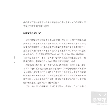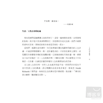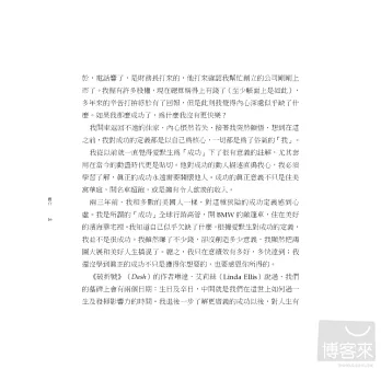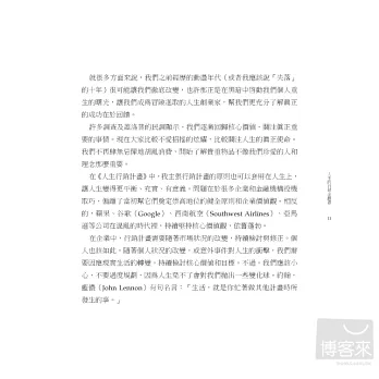 找出人生的真正目的並非易事,那是個流程。本書提供一套目標導向的藍圖,務實又熱血,啟動你展開個人旅程,提醒你把時間投入在最重要的事物上,並達到真實的成功――成功的關鍵,是在賺錢與創造意義之間拿捏微妙的平衡。恰如愛默生所說:知道一個生命因你的存在而活得更加愜意,那就算成功了。