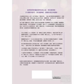 如果你也覺得活著很辛苦,很想讓勇氣和幹勁從內在湧現,請全力實踐「讚美日記」,只要每天短短幾分鐘,掌握書中23個寫作技巧,生命就能找到出路,讓愛與幸福自然活化、浮出表面。