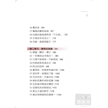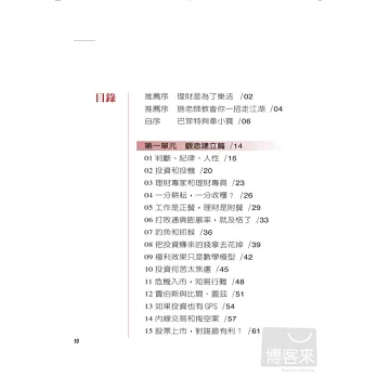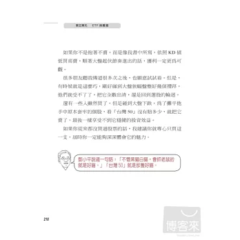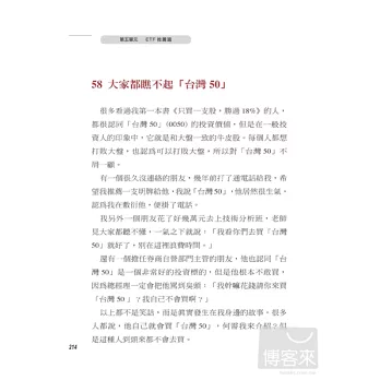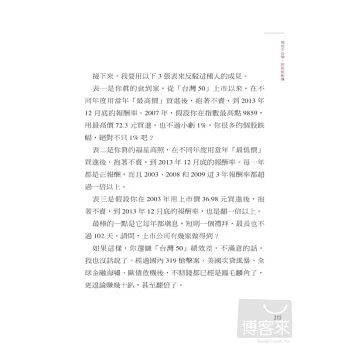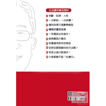 一法明,萬法通,當能掌握真正正確的投資觀念後,就不會苦於追逐數字,投資才會是一種正向的活動。最後,再以一個買賣「台灣50」(0050)的實際案例,分享簡單投資的技巧。可說是心法與實務操作兼備。