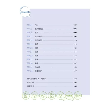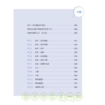 1地形:地形總論∕2地形:地形判讀∕3地形:海岸∕4地形:島嶼∕5氣候:氣候總論∕6氣候:氣候分類∕7氣候:台灣的氣候∕8水文∕9土壤∕10生物∕11環境議題1∕12環境議題2∕13地圖與位置∕14人口∕15聚落與交通∕16農業∕17應用地理1∕18應用地理2∕19台灣∕20中國∕21亞洲∕22歐洲∕23非洲∕24美洲∕25大洋洲∕26全球世界