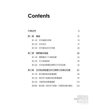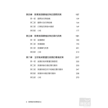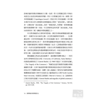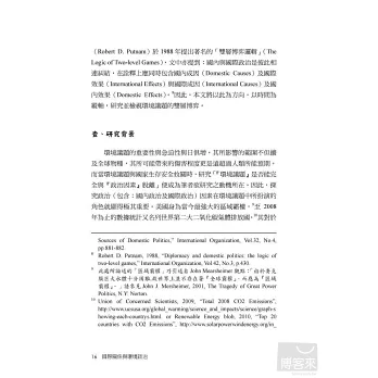 內容分別介紹「現實主義」、「自由主義」、「建構主義」等三大國際關係理論,以作為其與環境政治結合的重要背景。此外,透過介紹影響美國環境政策的國際、國內因素,了解國際環境政治中不同行為者之間的互動與影響。最後,以環境議題的「雙層博弈」特性等探討議題做結。