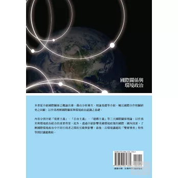 本書從介紹國際關係之概論出發,藉由分析層次、理論基礎等介紹,輔以國際合作相關研究之回顧,以作為理解國際關係與環境政治認識之基礎。