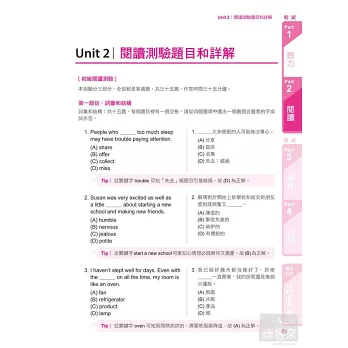每道試題附有最詳細精闢的解析及答題技巧,主題式文法解說,特以簡潔易懂為前題,讓你不用動腦就能直接反射出正確的回答,破除台灣讀者在閱讀測驗時對文法的恐懼。