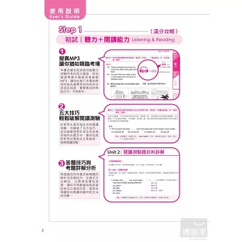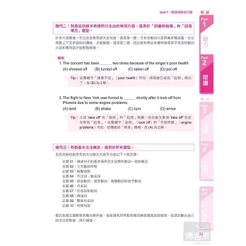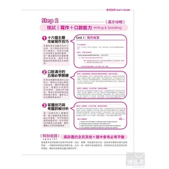 本篇將寫作測驗分為句子改寫、句子重組及短文寫作三個單元,特設文法概念加強學生最弱的環節,每一練習題附有詳細解釋與作答秘笈,讓你不用動腦就能輕鬆寫出完美解答。