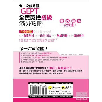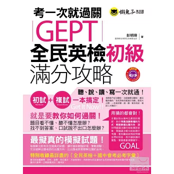 《考一次就過關GEPT全民英檢初級滿分攻略》針對台灣考生最弱的環節,教你用最淺顯易懂的方式,輕鬆掌握出題方向,讓你問題還沒聽完就能猜到答案,閱讀還沒看完就能猜中考題,看到圖就能預設問題並想好回答。並教你讀該讀的重點,掌握最重要關鍵字!
