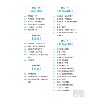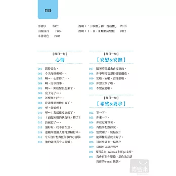 配合主題句,各單元安排短篇互動對話,從日本人的生活情境學習「每日一句」怎麼使用,具體落實「每日一句的用法場面化」。