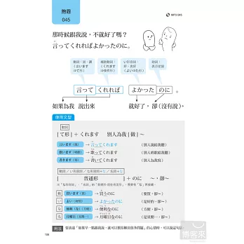 「被覺得見外」和「被覺得不禮貌」,當然是「不禮貌」比較嚴重。所以專門替外國人寫的日語學習教材,都是先教學「丁寧體」(避免說話者讓人感覺粗魯沒禮貌),日本人生活中慣用的「普通體」,就容易成為學習時的「弱項」。或許能夠猜到「普通體」的意思,或是照著日劇對白開口說,但卻缺乏紮實的文法理解。為了彌補此點學習上的不足,本書針對兩種文體提供了具體而詳細的對比說明。