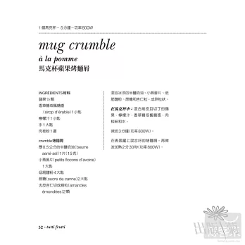 所有的材料都以湯匙計算,大匙(湯匙)和小匙(咖啡匙)更方便準備,完全不需秤量。依序加入馬克杯後攪拌一下放入微波,1分40秒完成!不論是在辦公室搭配咖啡,提振精神的快捷蛋糕;下班後超快速輕鬆端上桌的甜點;週末宅在家不必出門就可享用的下午茶點心…,簡單得連小朋友都可以自己做!