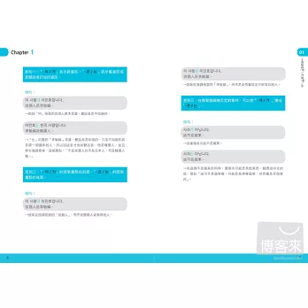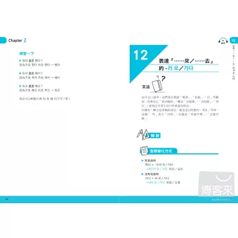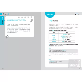 書中寫出在學習文法上容易混淆的部分,像是中文裡的「不」,韓語裡面有很多種表達方式,書中也一一列出解釋比較,讓人輕鬆搞懂複雜文法。最棒的是,還介紹許多韓國人日常口語用法,這是一般韓語教科書中學不到的,讓我跟韓國人溝通時更道地,看韓劇或韓綜也能更快理解!──Doris