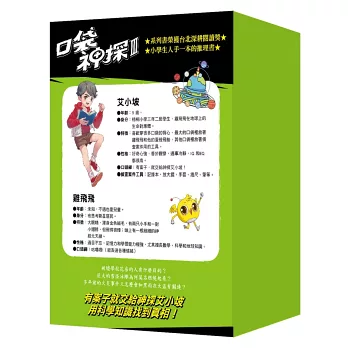 《口袋神探》這一系列,是專為小學生量身打造創作的推理故事,藉由書中生活化的情節,和知識單元的引導設計,能將孩子輕易帶進主角艾小坡的生活中,從而像小偵探一樣進入每一個案發現場,從每一幅特別設計的插畫中,尋找案情的蛛絲馬跡。
