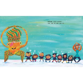 這個故事是關於被冰凍在湖裡的烏賊大王,如何在大家的幫助下脫困,而解救方法竟然是拿特大號水壺,淋上熱水!我和我家孩子都非常喜歡這個傳統的方法!事實上,這很可能是小孩子第一個想到的解決方法,我認為相當符合兒童心理。最棒的是,烏賊大王雖然被冰凍了,卻自始自終都沒有冷場,很讚!