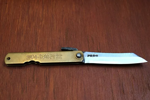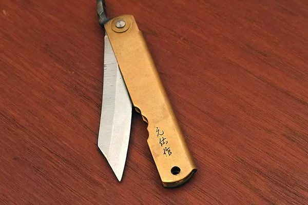 部分肥後守的刀柄材質為黃銅,經久使用之後會開始氧化、漸失光澤。若有需要可以使用銅油擦拭,恢復光亮表面。