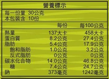 成份:組織化植物蛋白 (非基因改造大豆蛋白、非基因改造脫脂豆粉、玉米澱粉、小麥蛋白)、砂糖、碗豆粉、大豆沙拉油、鹽、芝麻、海苔、甘草粉、小麥纖維