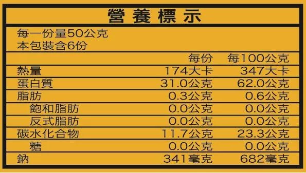 成份:非基因改造大豆分離蛋白、非基因改造脫脂豆粉、玉米澱粉、高筋麵粉、大豆沙拉油、大豆卵磷脂、碳酸鈣