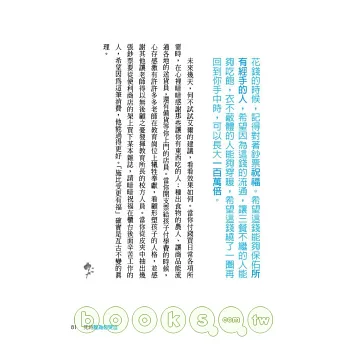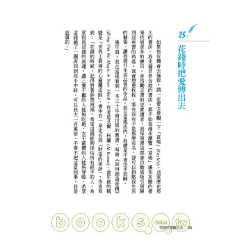 夏瑪知道一般人可以花在閱讀上的時間很有限,所以他的寫作風格都是「一槍中的」,本書的 101 條守則,篇篇簡短,但就像名言一樣,是作者花費多年才悟出的心得,只憑三言兩語就傳達完整了(請參考本書第 98 條:蒐集你喜歡的名言)。