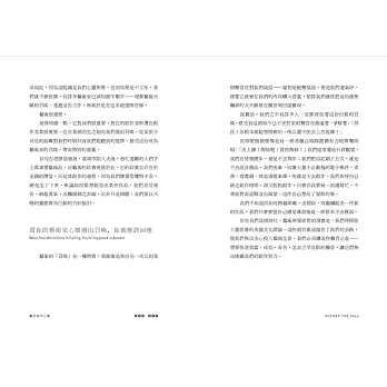 接受召喚成為藝術家,是一份難得、美妙,不會在其他人身上複製重現的祝福與眷顧。「人間天堂是你必須做出的選擇,而不是你必須找到的地方。」本書提供你在匯聚勇氣、做出選擇的創作路上,不會沒了理智、斷了生計,或是迷失方向,過著真心想望的人生。