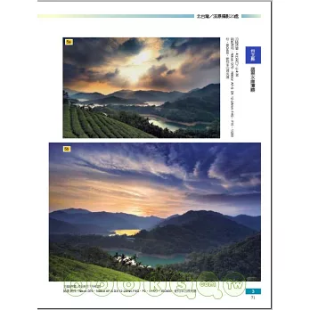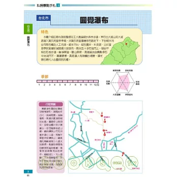 由暢銷書「旅遊、自然攝影技法」一書中延續圖解寫法,一一的闡述各個景點的行程規劃、最佳時機(每張照片皆載明拍攝日期與時刻)、使用器材(相機與鏡頭型號)、拍攝資料、路線地圖、大眾運輸路線(捷運、公車轉乘以及步行時間)、停車地點、相關食宿資料等。