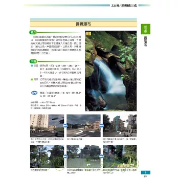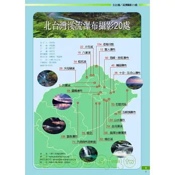 喜愛山林溪瀑攝影的朋友,週休假日遠離城囂,享受清幽與溪流之美,請跟著攝影家手札嚴選「北台灣最佳溪瀑攝影20處」的腳步,您沒走過的景點,每篇提供您休閒旅遊指南及指引圖,還有GPS衛星定位的搜尋關鍵字以及經緯度,輕輕鬆鬆遊遍私房景點,您會發現台灣世外桃源、清山綠水的美景。與所有的人分享,是仁者樂山的與世無爭,是智者樂水的波瀾壯闊,讓大家一起走進真實感的桃花源!