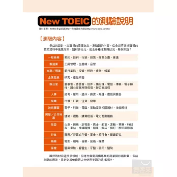 多益考試不外乎五大類相關用語,為了讓你更有系統地準備,本書細心為你分類,考試的時候只要看到、聽到相關情境,便能立刻啟動你的反射神經,連結相關情境會運用到的單字,保證考試不慌張,因為你就是個超強的單字資料庫!