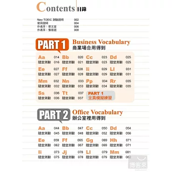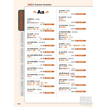 本書每個單字後面皆加上編號,第一碼為該單字所屬的相關分類,後面出現的數字則為該單字在所屬相關分類中的序號。例如:1-47表示這個單字是Part1商業用語中的第47個單字。同反義字也會列出單字編號,讓你可以輕鬆交叉查找。
