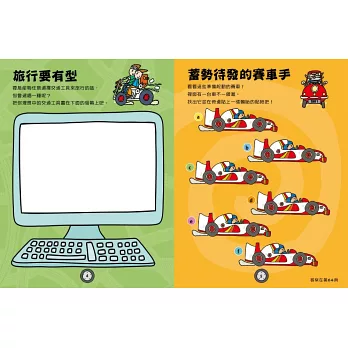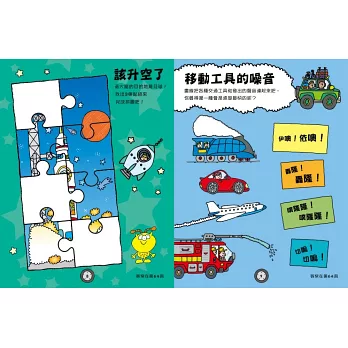 翻開這本書,你將搭上各種交通工具遊遍陸海空!你喜歡熱氣球、直升機、或是太空梭嗎?為了探索全世界,請為書中的人物選擇合適的交通工具!