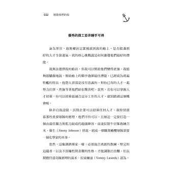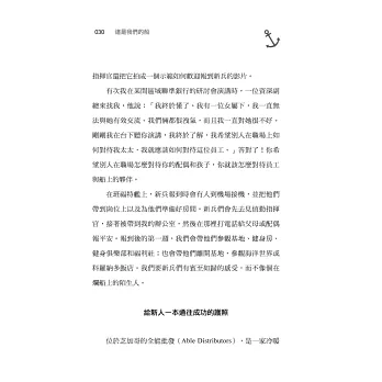 成功的組織必須卓越:優秀的領導者要向員工展現何謂卓越,並激勵他們自動自發完成任務。透過群策群力,建立員工自信,給予低階員工尊嚴,讓每個人都能共享組織成功的利益。領導者越快將它變成「我們的」船,「你們的」船越能全速前進。