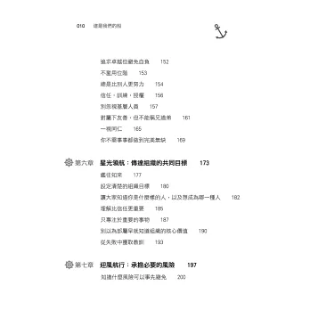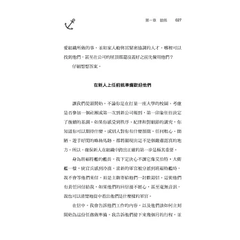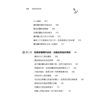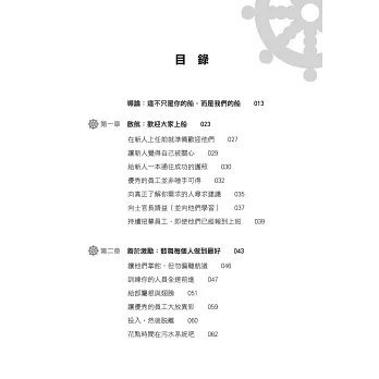 歡迎大家上船:領導者應該懂得吸引對的人才,運用熱忱、歡迎來帶領新員工上任,並使他們快樂且期待每一天的工作。下馬威只會使新成員感到惶恐,惶恐只會阻礙任務的達成。