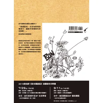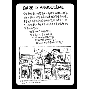 這本《安古蘭遊記》,將由這位資深漫畫作者,一步一腳印,一杯紅酒一盤鵝肝,跟著他,走入這個聽說節慶時熱鬧擁擠、平日清靜無人的法國小鎮。