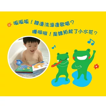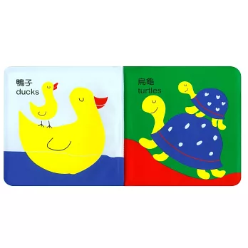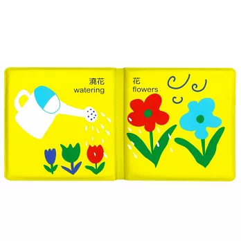 這本書也能做為寶寶的第一本語文書,書中每一頁的圖畫具體簡單,配上與水有關的單字,例如:鴨子(ducks)、河馬(hippo)、青蛙(frogs)、澆花(watering)……中英雙語對照,幫助寶寶同時吸收、學習兩種語言,認識生活中常見的事物,是洗澡時最合適的語文書。