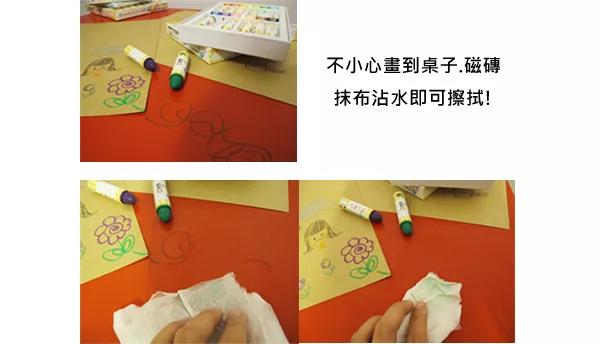 不小心畫到桌子.磁磚.木板,可用抹布沾水擦拭喔!
