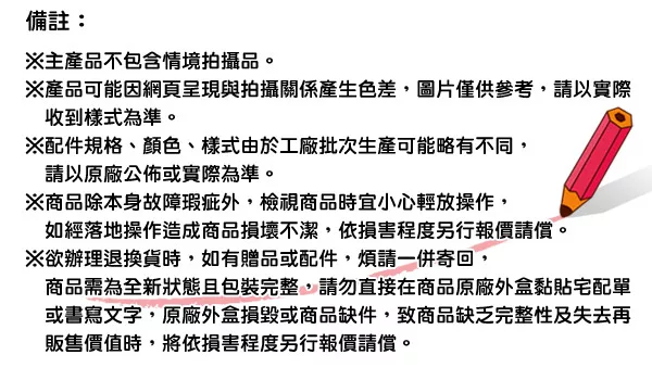 辦理退換貨時,商品必須是全新狀態與完整包裝(請注意保持商品本體、配件、贈品、保證書、原廠包裝及所有附隨文件或資料的完整性,切勿缺漏任何配件或損毀原廠外盒)。退回商品無法回復原狀者,恐將影響退貨權益或需負擔部分費用。