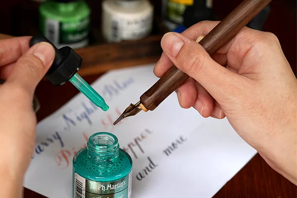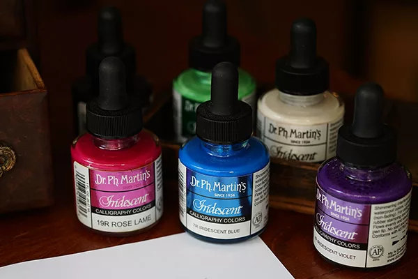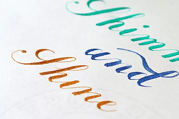 珠光彩墨所含的亮粉非常多、因此寫出來的效果相當明顯,覆蓋力很好,寫在深色紙張上也有良好的發色。此外,珠光彩墨還具有防水功能,這使得可應用的技巧也變多了,它同時具有抗光效果、不易褪色。滴管瓶裝也能準確控制沾墨量、也較不易弄髒筆桿。