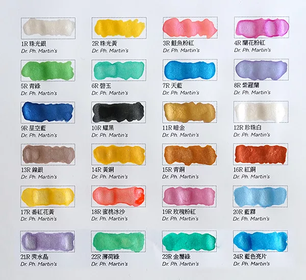 這次介紹的是馬汀博士的珠光彩墨系列。本系列墨水共有24種顏色、每種均加入亮粉,是目前市面上擁有最多顏色的亮粉彩墨。
