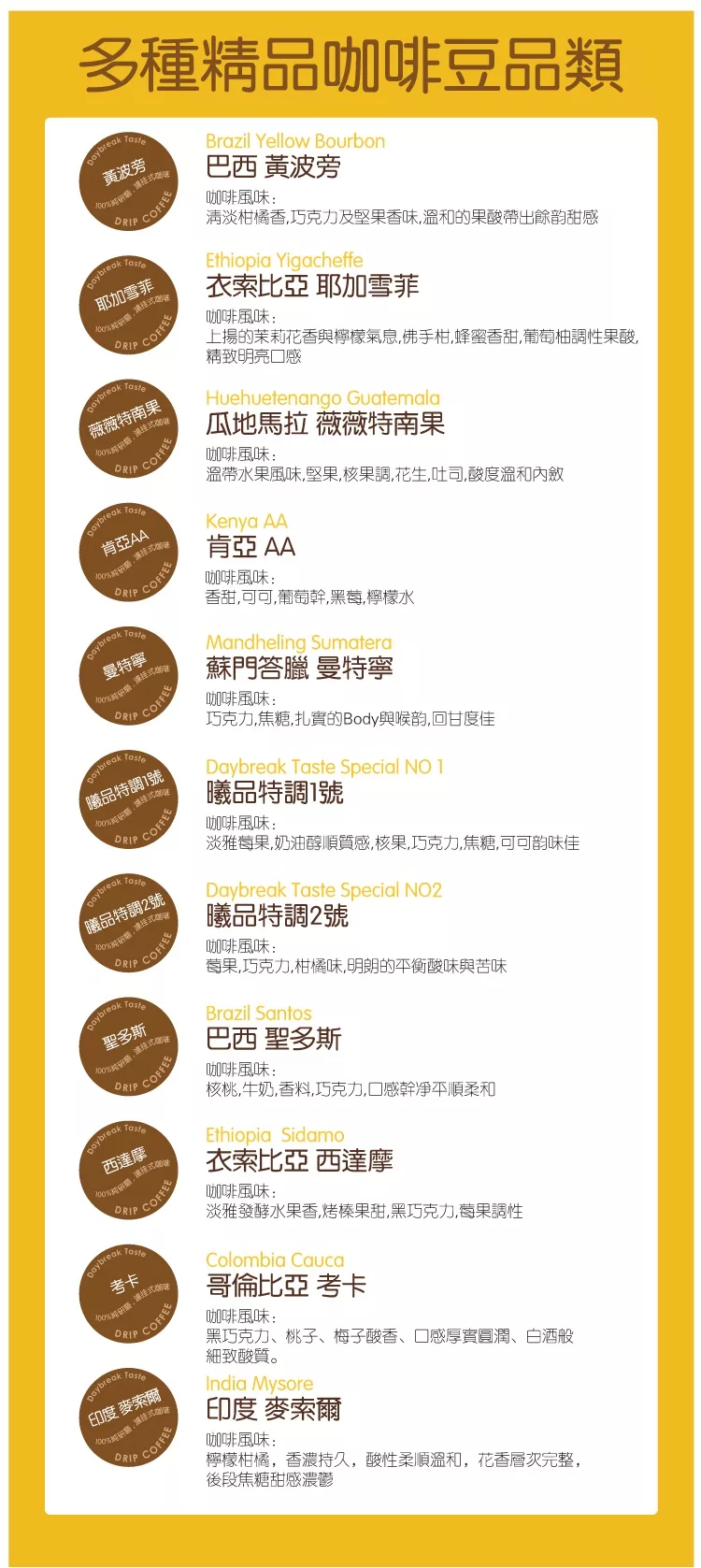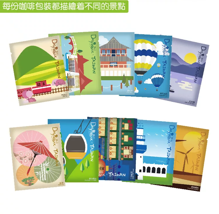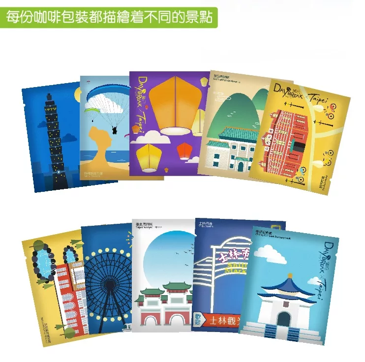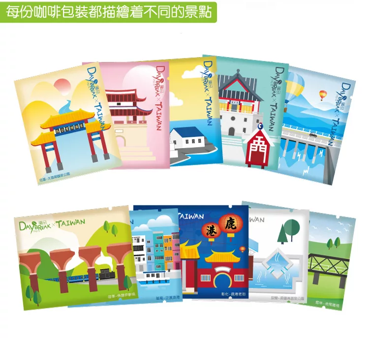盒內5份咖啡,每一盒的包裝都描繪著台灣的景點(隨機出貨)