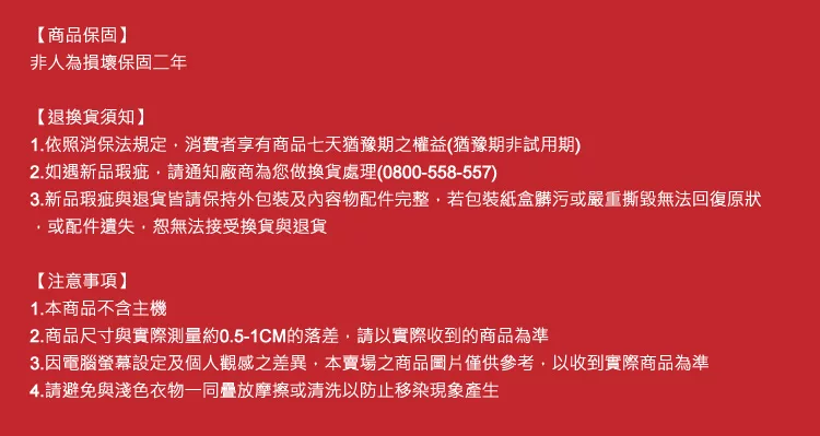 辦理退換貨時,商品必須是全新狀態與完整包裝(請注意保持商品本體、配件、贈品、保證書、原廠包裝及所有附隨文件或資料的完整性,切勿缺漏任何配件或損毀原廠外盒)。退回商品無法回復原狀者,恐將影響退貨權益或需負擔部分費用。