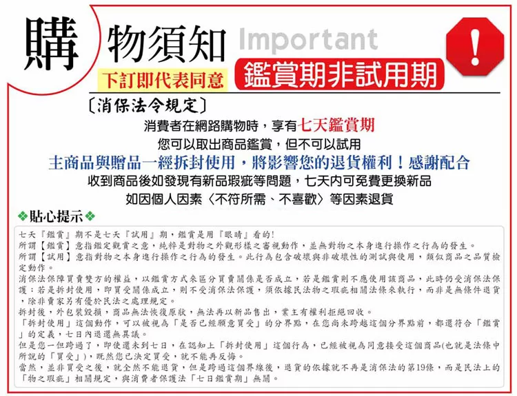 非屬上列品項之商品均享有到貨十天的猶豫期(含例假日)。退回之商品必須於猶豫期內寄回。