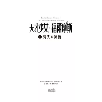 母親究竟去了哪裡?艾諾拉努力循線解開密碼,找到母親藏在屋子各處的私房錢,但從倫敦趕回來的大哥麥考夫與二哥夏洛克在乎的卻是妹妹像不像個淑女,一心只想把她送進寄宿學校!艾諾拉只好偷偷離家,踏上尋找母親的旅程,但才踏出莊園便出乎意料地捲入一位侯爵的綁架案——如今,找到失蹤的母親,設法解決綁架案,救出侯爵都讓她焦頭爛額,但最困難的是要如何行動,她才能不被史上最偉大的偵探、氣急敗壞的哥哥夏洛克·福爾摩斯抓回家……