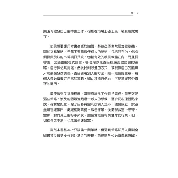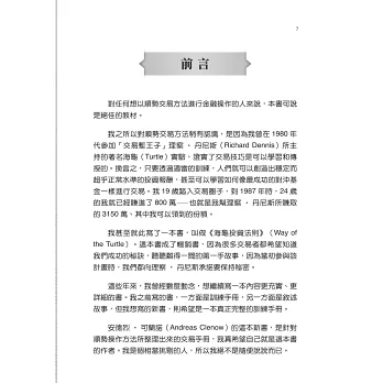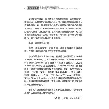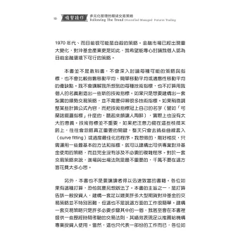 大多數人之所以失敗,往往是因為太過強調進場/出場法則之類的瑣碎枝節。交易領域無所不包,從那斯達克指數到美國國庫券,乃至於交叉外匯、白金、精豬肉等,不論經濟狀況與股票行情如何,金融市場始終存在賺錢機會。只要深入分析順勢操作逐年的績效與屬性,讀者就可以真正瞭解大規模期貨交易的實際狀況,還有各種難題與機會。