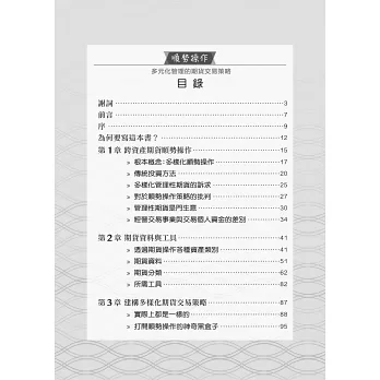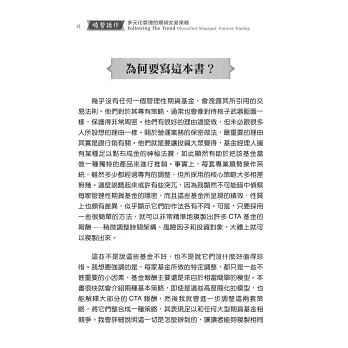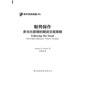 過去30年來,不論是碰上多頭或空頭市場,投資領域總有一群對沖基金與專業交易者,其表現穩定勝過傳統投資策略。他們所展現的傑出績效,在2008年的大空頭市場時,更創造出破紀錄的獲利。這些交易者通常不願輕易談論他們特有的交易運算方法,而且研究團隊裡往往聘請了很多頂尖的博士專家。可是,本書藉由相對簡單的模型,就可以複製出這些玩家們的交易績效。這些跨資產順勢操作期貨經理人,也就是一般所謂的CTA,在市面上有很多談論他們的書籍,但沒有任何著作能夠如此詳細解釋其策略,而讓讀者足以複製他們的成功,乃至於創辦自己的順勢操作事業。