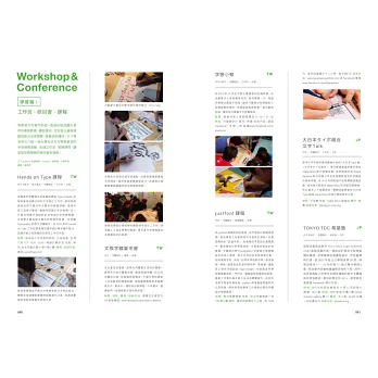 除了字型設計技術面相關知識外,本期也收錄了豐富字型相關學習情報,包括台灣、日本兩地的字型相關學習工作坊、研討會、短期課程資訊,以及字型設計師岡野邦彥、張軒豪至荷蘭海牙皇家藝術學院的字型留學經驗談、美國TypeCon字型研討會的參加心得等,對學習字型設計有興趣的讀者,這些資訊將會成為你最好的入門指引。