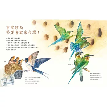 春天騎樓下的家燕、大家耳熟能詳的黑面琵鷺、繽紛斑斕的八色鳥、個頭巨大的東方白鸛和丹頂鶴、體型嬌小的日本鵪鶉和柳鶯……,都是在台灣可以見到的候鳥。可以擁有這麼多與候鳥近距離接觸的珍貴相遇,讓我們格外珍惜身在台灣的特別之處,也敬佩這些為了生存、冒著生命危險遠道而來的旅人,是這本繪本最初的出發點。