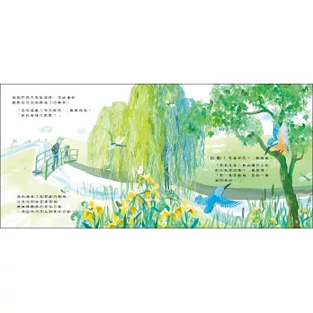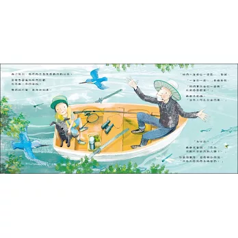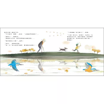 ◎這本書帶著我們一起沿著河岸,和祖孫一同在大自然中漫步。透過對話,他們一起觀察河邊的生態。文字甜美抒情,正如圖畫所描繪的,柔和、豐富、迷人的水彩畫完美的搭配了文字。年輕的孩子和年邁的爺爺,新的開始和不可避免的時間流逝,是大自然循環的溫柔隱喻。——大衛.梅林(作家兼插畫家)