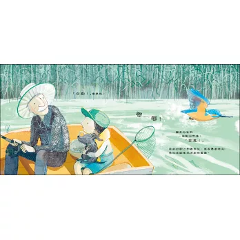 ◎故事中,爺爺透過對翠鳥、食物鏈、蜉蝣、蜻蜓、養育雛鳥的觀察,向孫子講述生命的循環。隨著翠鳥的消失,爺爺說:「沒有人會永遠活著,只有大自然會永遠存在。」爺爺與年幼的孫子是鮮明的對比,爺爺飽經風霜,而孩子則是一隻蓄勢待發的箭。非常喜歡這本書的圖畫,尤其是翠鳥潛水捕魚的戲劇性場景。——派翠西亞