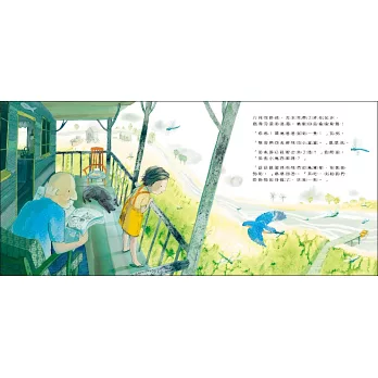 ◎這個故事透過翠鳥的生命週期,訴說生命的傳承,一代又一代,每個人都接下了生命的接力棒。我喜歡這個故事以抒情的散文和淡雅的水彩,描述大自然的美麗。對我來說,這不只是描繪祖孫情誼和生命傳承的繪本,也是認識翠鳥生態的動人故事。——阿曼達‧希普頓老師