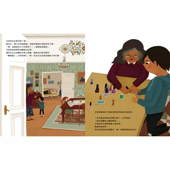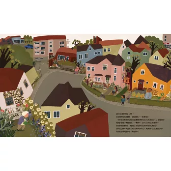這五個老奶奶好朋友也住在教堂街,她們各個都很有個性,有人會教他擦指甲油,有人和他一起騎腳踏車、種花、做蛋糕,也有人只是跟他一起坐在搖椅上發呆、吃餅乾,這些看似細瑣的日常,引領小男孩一探大人世界的奧秘,也為他帶來許多生活上的小樂趣。值得一提的是,這些老奶奶住的房子也是各有特色,有人住在天花板畫滿畫的小城堡,有人住小紅磚房,也有人住在大型公寓裡或石頭造的房子裡。這些不同性格的老太太們和她們的房子,讓整本書營造出一種熱鬧多彩而豐富的氛圍。故事的轉折是其中一位和小男孩交情最好的老奶奶過世了,這個悲傷的事件帶給小男孩不小的衝擊,他也因此封閉自我好一陣子,所幸其他的老奶奶好朋友們依舊每天出現在他的生活裡,努力的用盡各種方式陪伴他度過這段悲傷時期。後來,過世的那位老奶奶住的房子搬進了一個小女孩,小男孩於是有機會也和自己年齡相仿的孩子交朋友,開始了另一段美好的友誼。