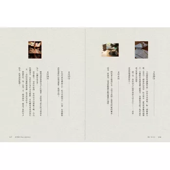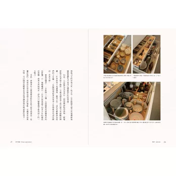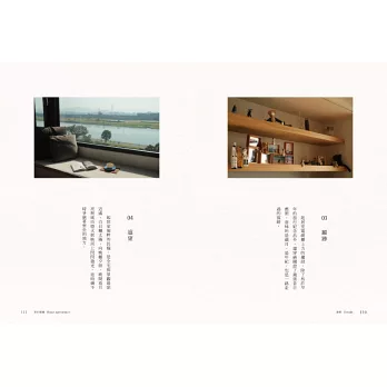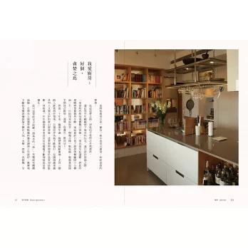 【態度篇】有葉怡蘭關於「在家這個場域裡安頓身心」的種種體悟,例如天光、窗景、空間留白的捨取,例如讓做菜和工作變得毫無滯礙的書房與中島廚房,又例如因為規劃合理,讓收納不必是一種美德,而是「順手方便」的自然動作;【細節篇】以最近距離看細細琢磨出的各種設計巧思與信手拈來的空間小驚喜;【日記篇】娓娓呈現了從改裝前到入住後長達一年的觀想,相較設計施工這些勞心勞力的嚴肅工作,日常的極短對話與隨筆則令人莞爾;【對話篇】記錄了「業主葉怡蘭」與「設計師李靜敏」的精采對談:包括「空間的破題」、「小空間中的以小見大」與「減法的設計」。