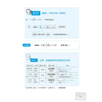 【文法解說】:彙整全書13 ~ 24課文型文法要點,內容媲美日語文法書,但又更簡單易懂。可隨時查詢,並能有系統地串聯全書的重要概念學以致用。