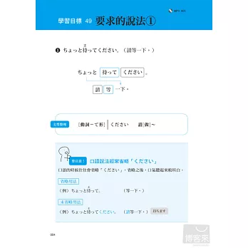 作者以「由簡入繁、由基本到延伸」的概念,安排44個具體學習目標。優先出現的,一定是最基本、最常見的,再依序出現更多元的用法。以日語常見的「動詞變化te形」為例,書中分列七個學習目標,將「te形」結合七種文型,引導大家由淺到深,逐一學會由「動詞te形」構成的七種實用表達: